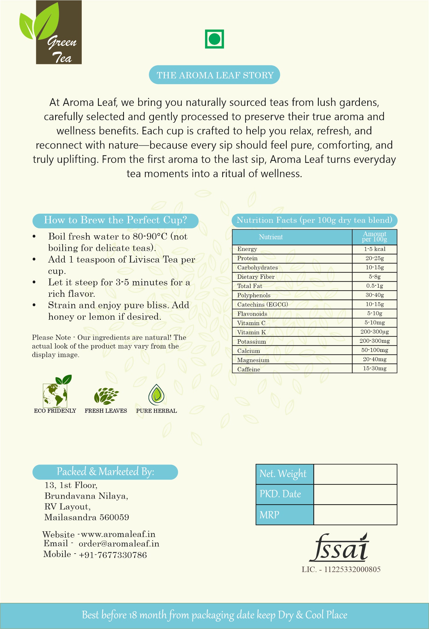 Green tea leaves are known for their high antioxidant content, helping to support metabolism, detoxification, and overall vitality. Elderflower, traditionally used in herbal wellness, adds calming and immune-supporting properties while enhancing the tea’s aroma and smoothness.
