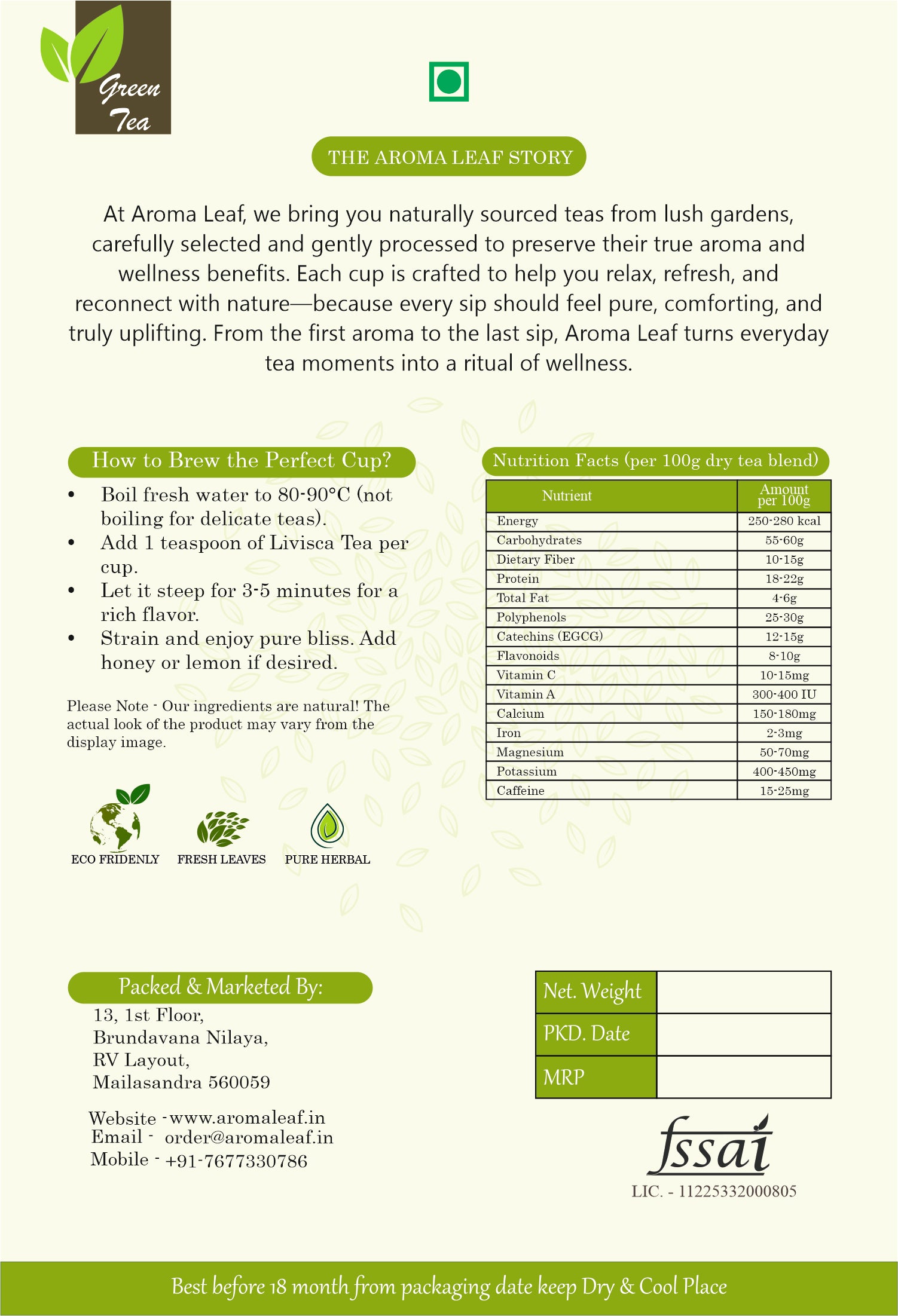 Whether enjoyed in the morning for a fresh start, after meals for digestion, or in the evening for relaxation, Aroma Leaf Herbal Mint & Basil Green Tea supports holistic well-being while delighting your senses with its smooth, refreshing flavor.