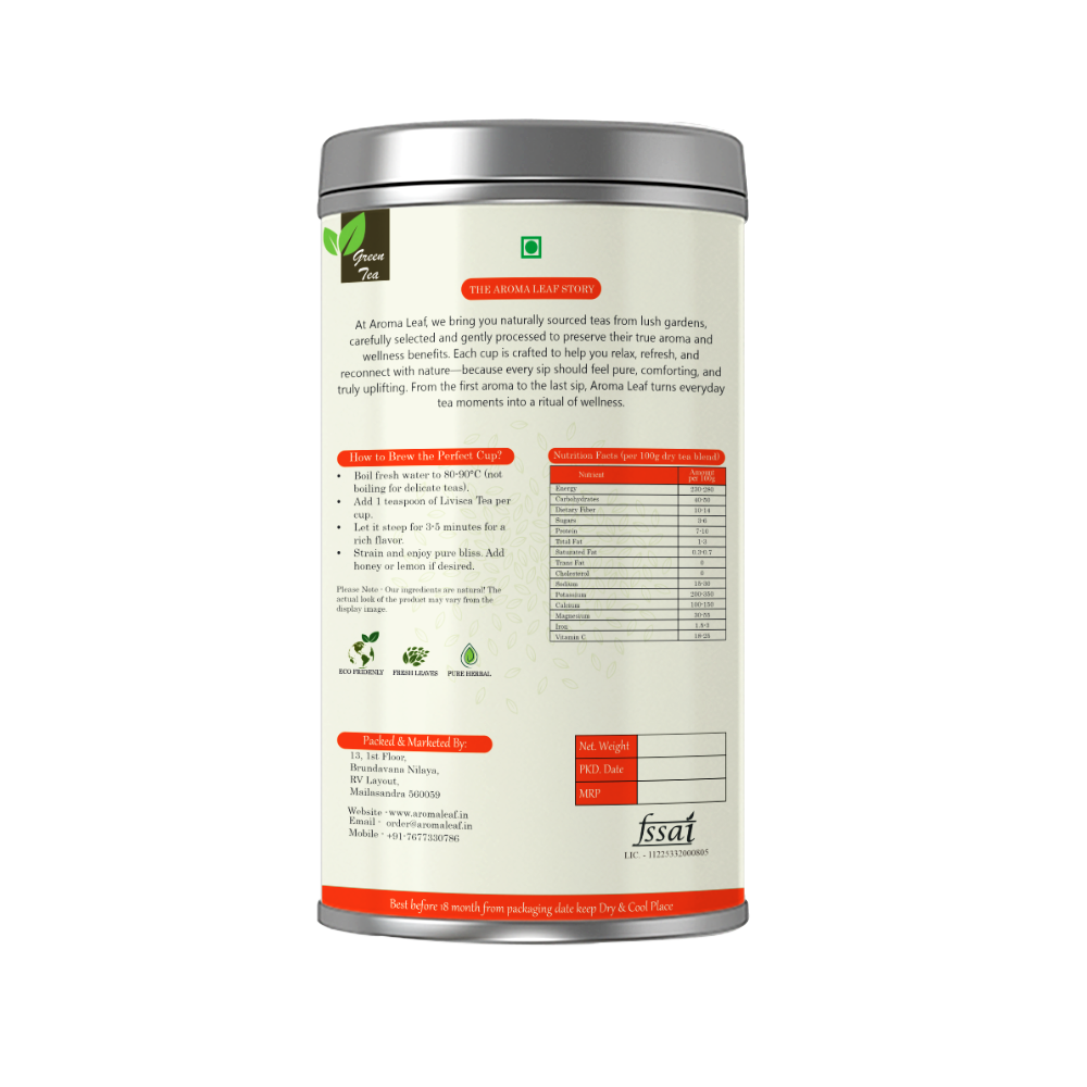 Aroma Leaf Hibiscus & Rose Green Tea is a beautifully balanced floral infusion crafted to refresh your senses and nourish your body from within. This elegant blend combines handpicked Hibiscus Petals, fragrant Rose Petals, and premium Green Tea Leaves to deliver a naturally vibrant, aromatic, and soothing tea experience.