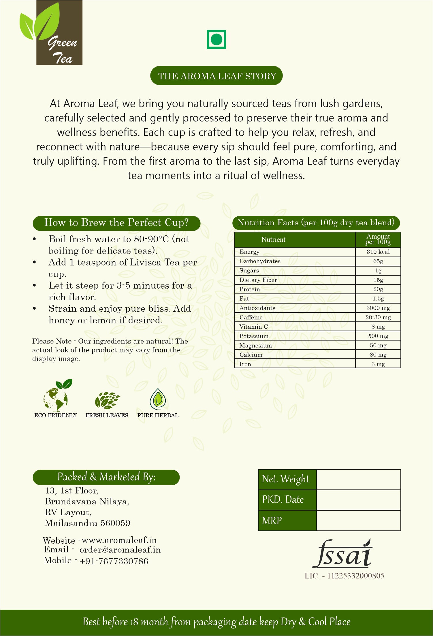 This light, smooth, and naturally caffeine-balanced green tea is perfect for morning freshness, post-meal comfort, or a calming afternoon ritual. Free from artificial flavors, colors, or preservatives, Aroma Leaf brings you a pure, mindful tea experience—just nature in every sip.